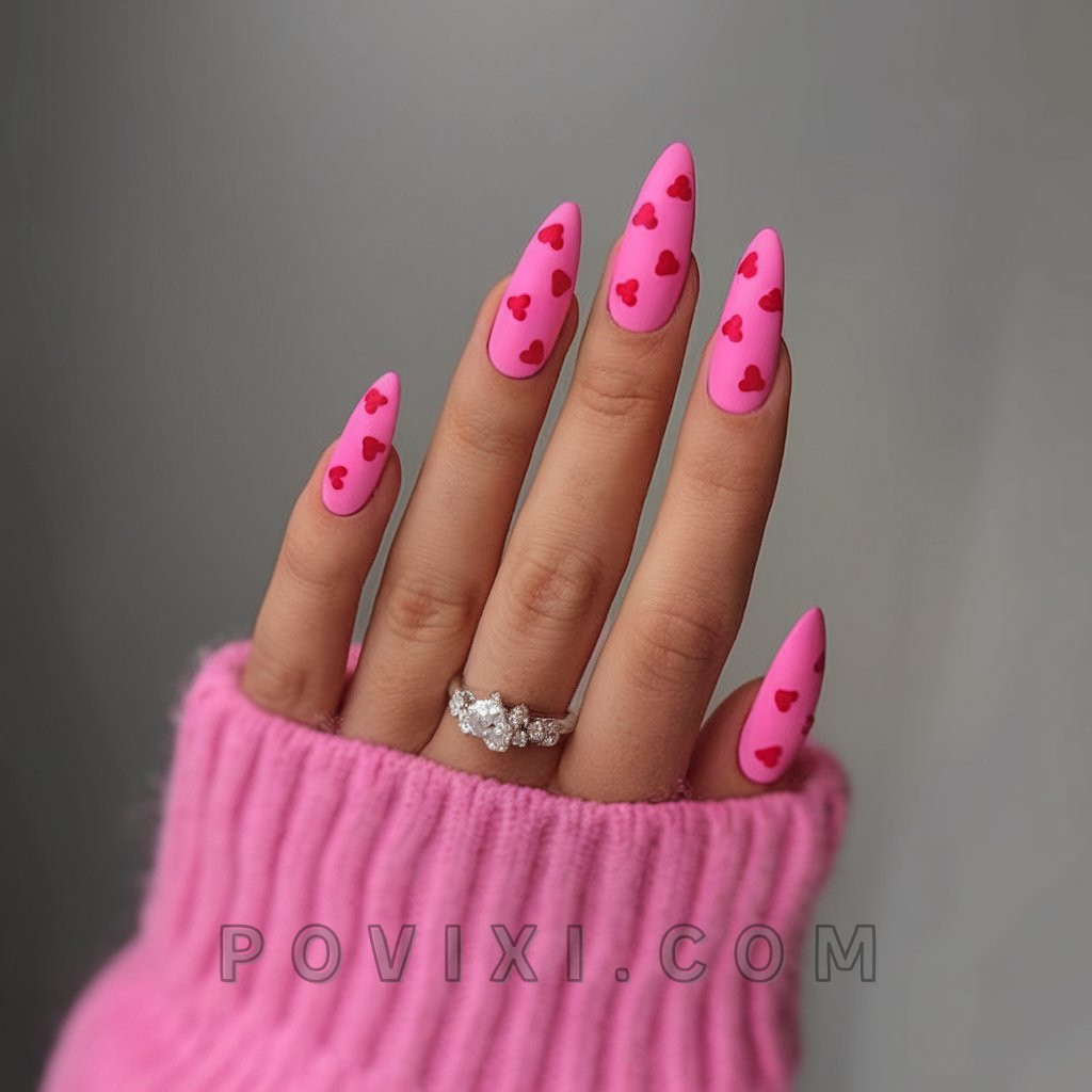 These almond-shaped nails use tiny red hearts to decorate a soft matte pink base for a romantic summer vibe. The design maintains a simple, pretty look that makes it perfect for romantic weekend getaways as well as sophisticated dates. The basic design would work with natural nails as well as lighter gel extensions if you prefer to use your own nails. Pair this stylish look with a pink cropped sweater and diamond jewelry as a finishing touch for an elegant yet cute look.