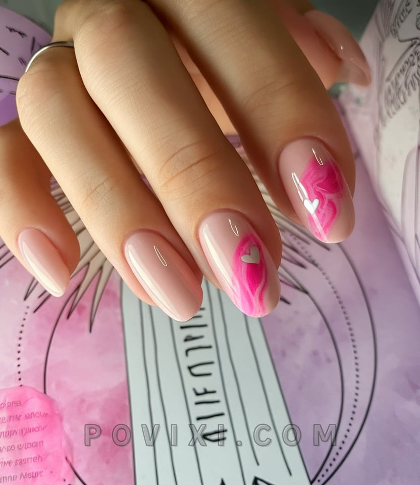 The gel nails bring together a serene pairing of nude and pink shades through distinctive heart motifs that dance across articulated swirls on the surface. This effect creates a smooth, shiny finish that appeals to people who prefer simple yet feminine nail styles. The oval shape of the nails creates an elegant look. Wear soft lingerie and pearl rings with blush makeup for an effortlessly elegant style.