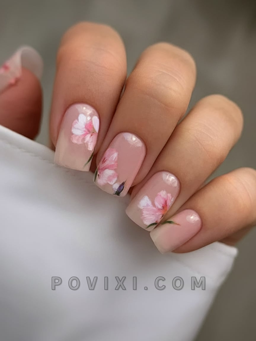 The soft beige-pink base creates an elegant painterly effect as delicate flowers bloom across its surface in this unique gel nail design. This shortened square style offers both functionality and a beautiful look for nail trends. The floral nail design is perfect for garden weddings, bridal showers and summer brunches. The look pairs well with white lace gowns and a rosy blush palette.