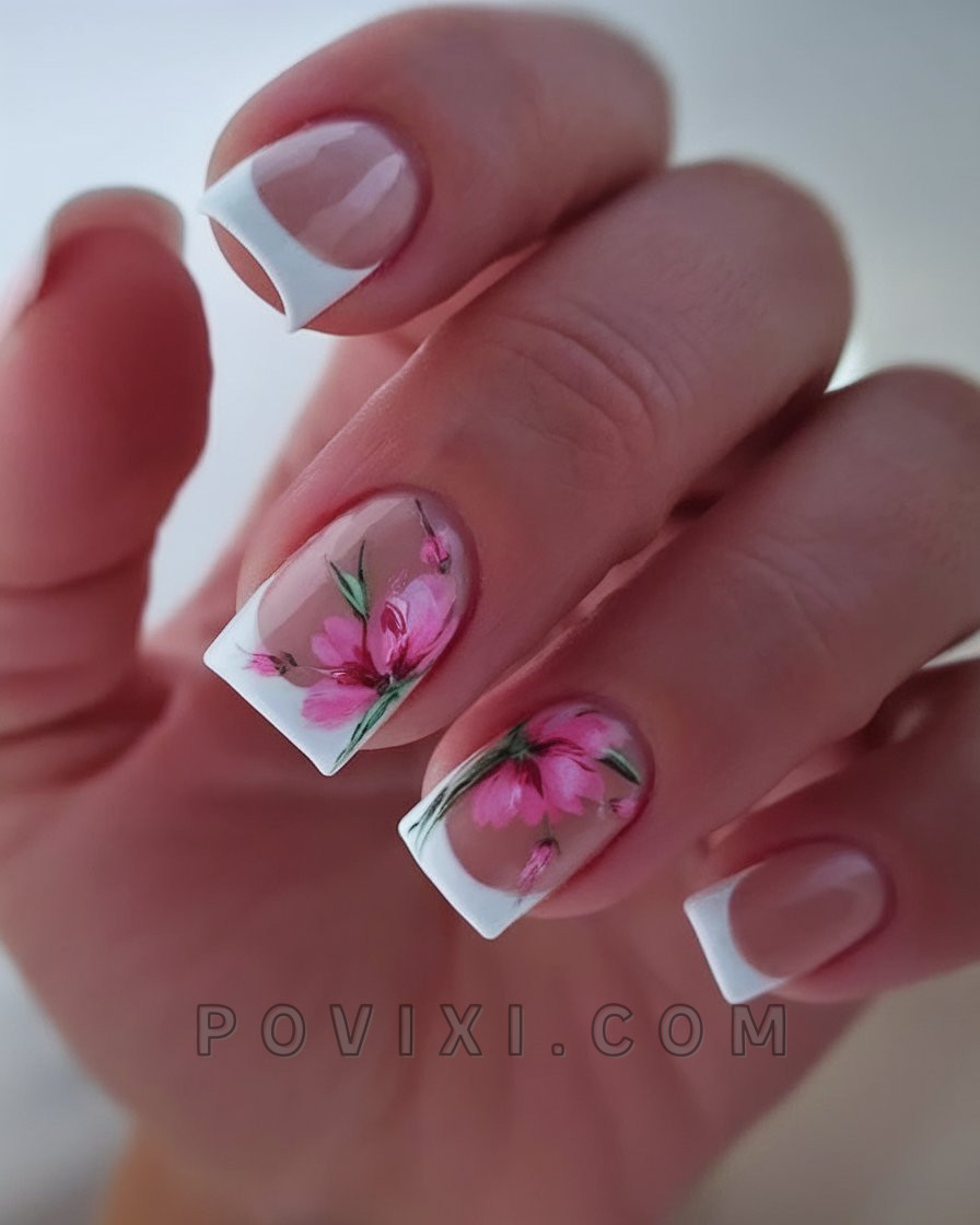 White arcs paired with hand-painted pink flowers create a French tip look. The transparent nail base next to the square natural nail design highlights the flower painting as the main attraction. The cute floral nail art design presents an elegant, timelessly charming summer style that provides a gentle floral accent without being aggressive. Sugar tones or sheer fabrics make the ensemble complete.