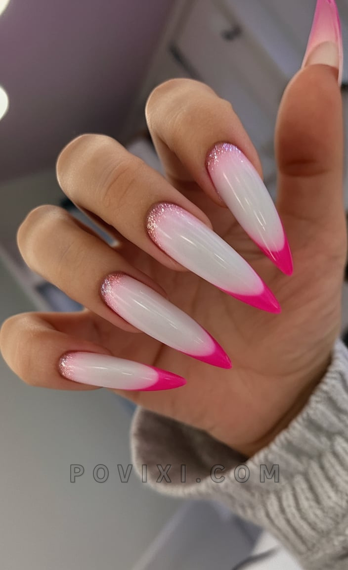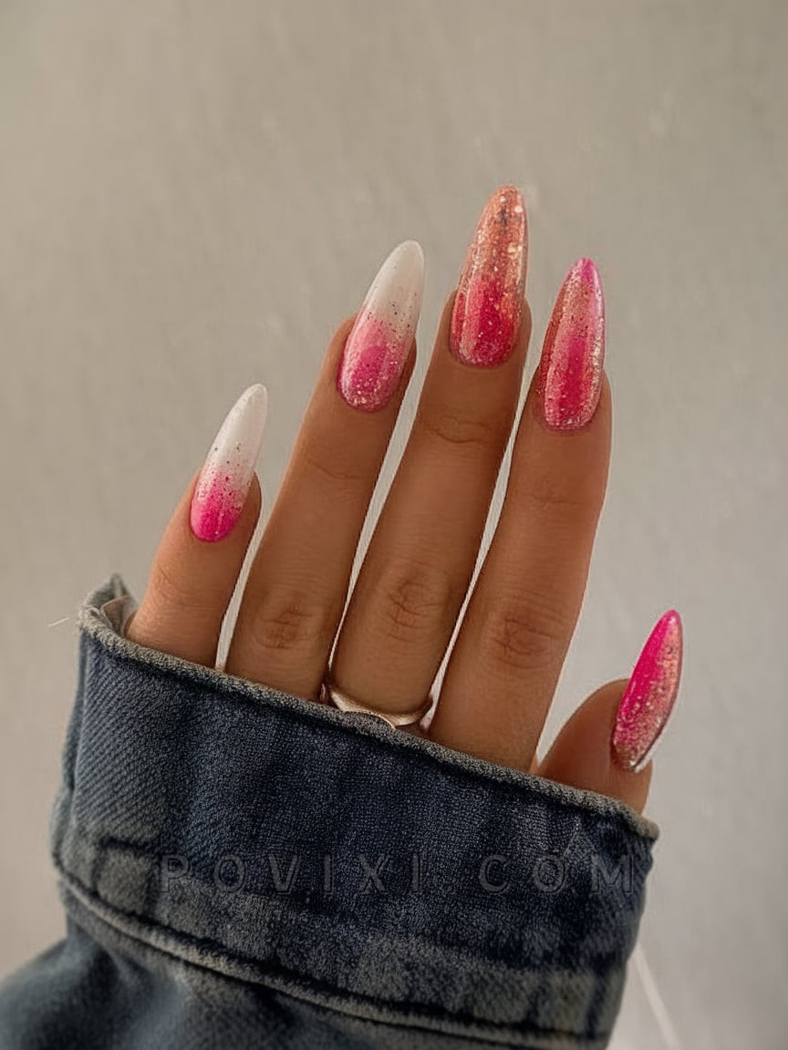 A gradient ombre effect uses shimmering glitter to transform long, almond-shaped nails from white to neon pink. Great depth comes from both the shimmery finish and the jelly-like transparent textures that vary throughout. Natural nails get an extra shine with this essential polish, which is equally at home at the beach bar or at a wedding.