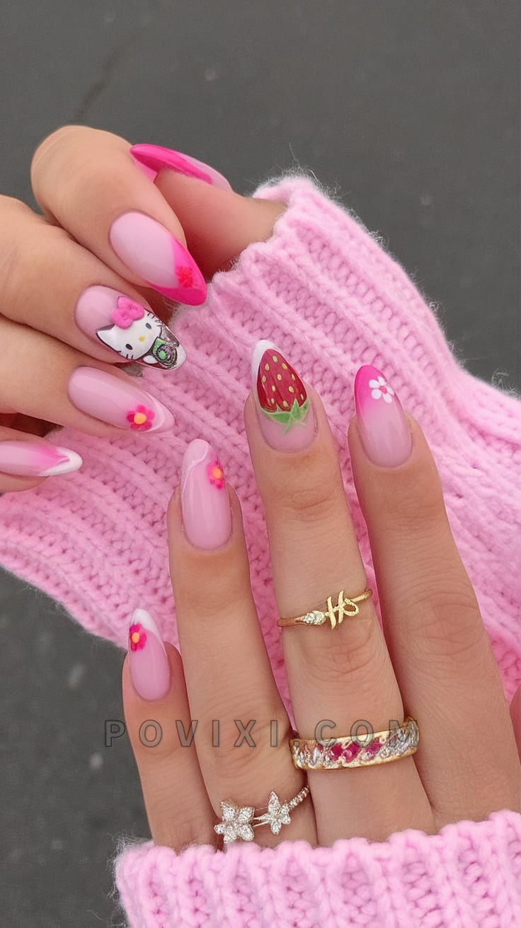 This short gel manicure features Hello Kitty elements and floral symbols along with strawberries for a nostalgic experience that promises sweet memories. The design combines the spirit of playful pop culture with delicate Japanese nail art elements. This style is perfect for festivals and days when a cartoonish look is needed. The pastel cardigan complements this look best with adorable hair accessories and a light friendly perfume.