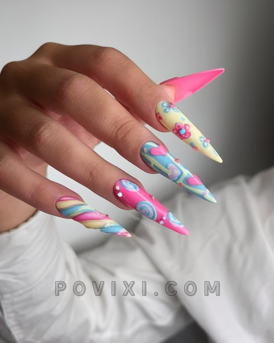 Enjoy a wild color journey when you get these acrylic nail designs. These modern 3D ornaments recreate the vintage lollipop look of the 2000s. Various hearts, blue and pink swirls, flowers and rhinestones create explosive designs on each coffin tip. This bright, ultra-creative nail display is for daring fashion lovers who want their nail art to stand out. Simple clothes should be paired with these manicured nails to steal the show.