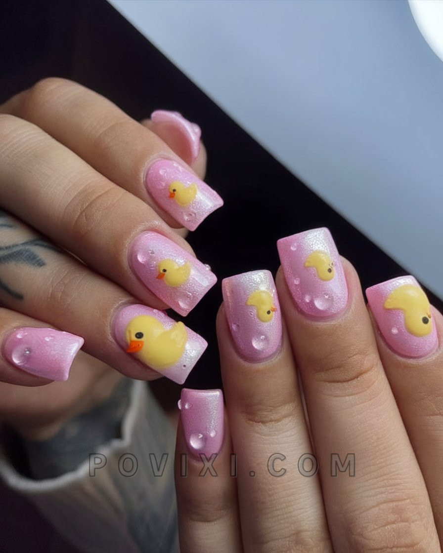 The playful approach with statement square tips appeals to people looking for pretty but bold nail designs. A grown-up bathing experience awaits with the iridescent light pink base that combines 3D rubber duckies and water droplets for nostalgic fun. The best part? It’s surprisingly wearable. The nail design looks great paired with soft denim jeans and oversized tees for a sweet summer fashion contrast.