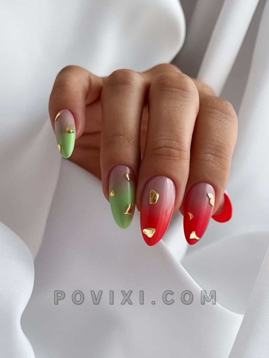 The manicure design presents summer vibes in an elegant way. The combination of soft green and pink ombre is refreshingly elegant thanks to the golden foil flakes. The almond nail shape shapes your hand beautifully and when combined with the foil, it creates an artistic fashion statement. This manicure offers a sophisticated dual experience that blends edgy elegance with playful charm. Wear the casual yet elegant sundress paired with embellished gold jewelry for an exquisite look.