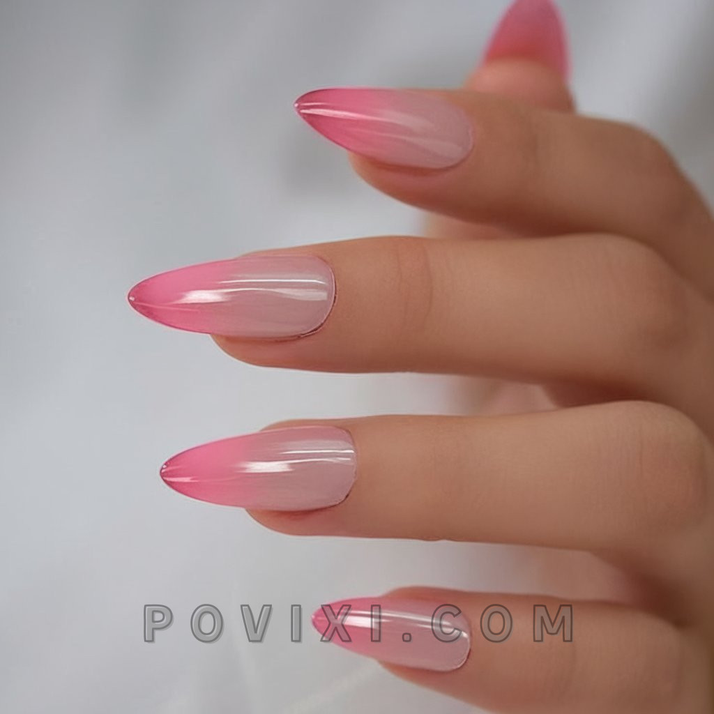 Combined with a perfectly blended pink gradient effect, it creates an everlasting appeal. The almond-shaped nails get their glassy facade from the glossy finish, which creates a jelly-like effect that ties in with contemporary fashion trends. The set offers the elegance of gel nails without excessive unnecessary volume, making it a great match for those seeking refined expressiveness. Think elegant white satin dresses with delicate gold jewelry and well-groomed hair to create polished summer moments that this style perfectly suits.