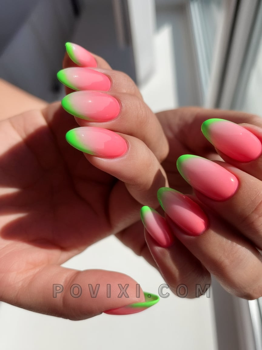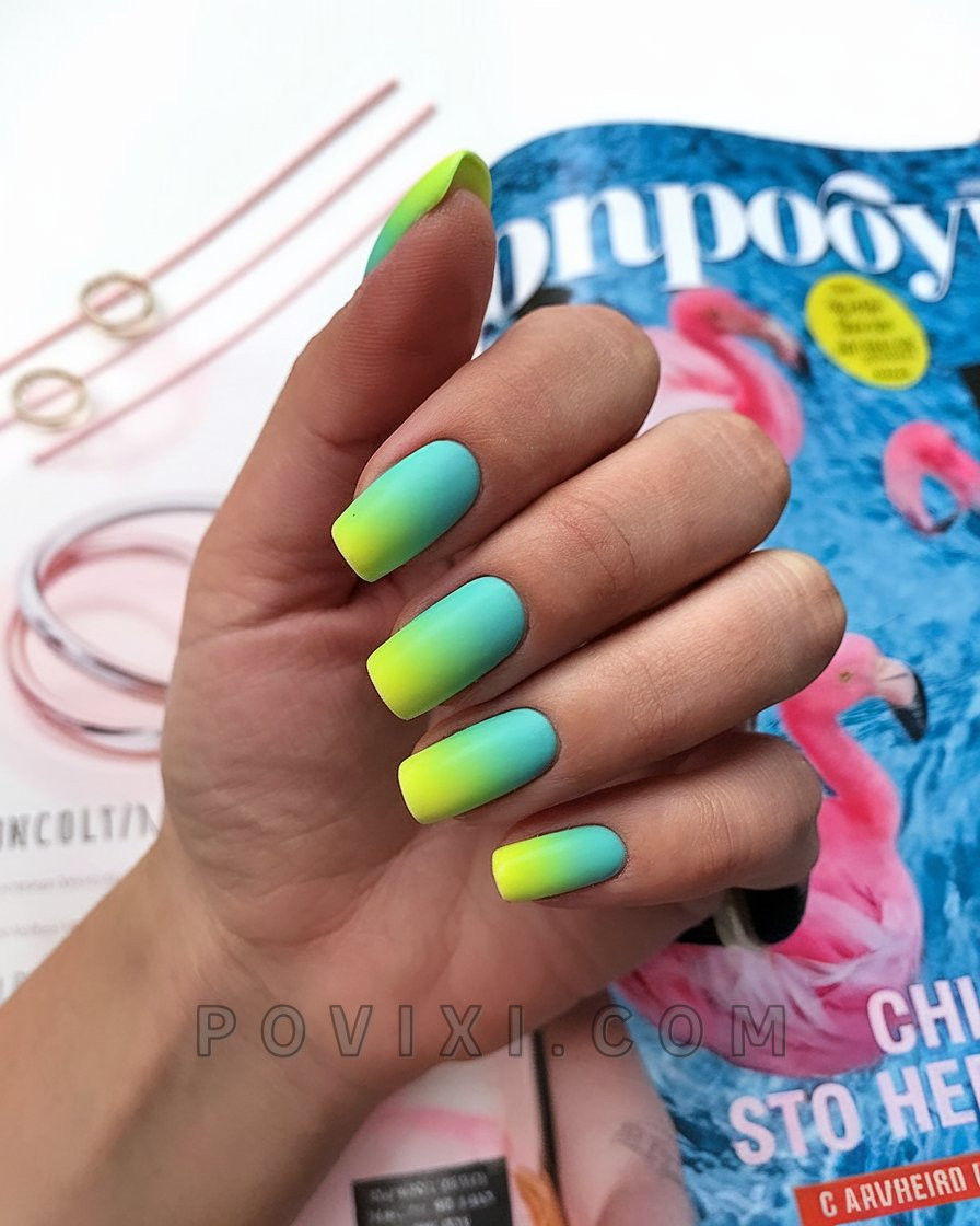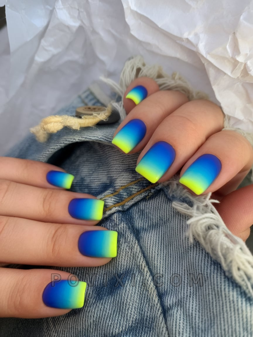 Channel the energy of a tropical smoothie with this neon lime to turquoise ombre. This nail art looks spectacular on square or oval nails to show off the full gradient effect. The matte finish tones down the brightness, making this look suitable for everyday wear, especially when paired with a fun swimsuit or festival ensemble. The vibrant color combination makes this nail design both lively and extremely fun.