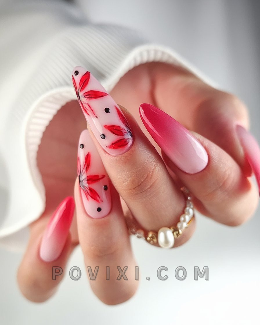 A soft artistic effect enriches the traditional pink almond nail with this manicure approach. This design starts with thin gradations between two colors before the addition of hand-painted red leaves and abstract dots add a botanical look to the composition. Ideal for those who enjoy personalized nail art, this manicure is perfect for brunch events and beach weddings, as well as transitioning from summer to spring. Dewy makeup will enhance your look when wearing floral dresses with soft fabrics as this nail design creates a totally feminine look.
