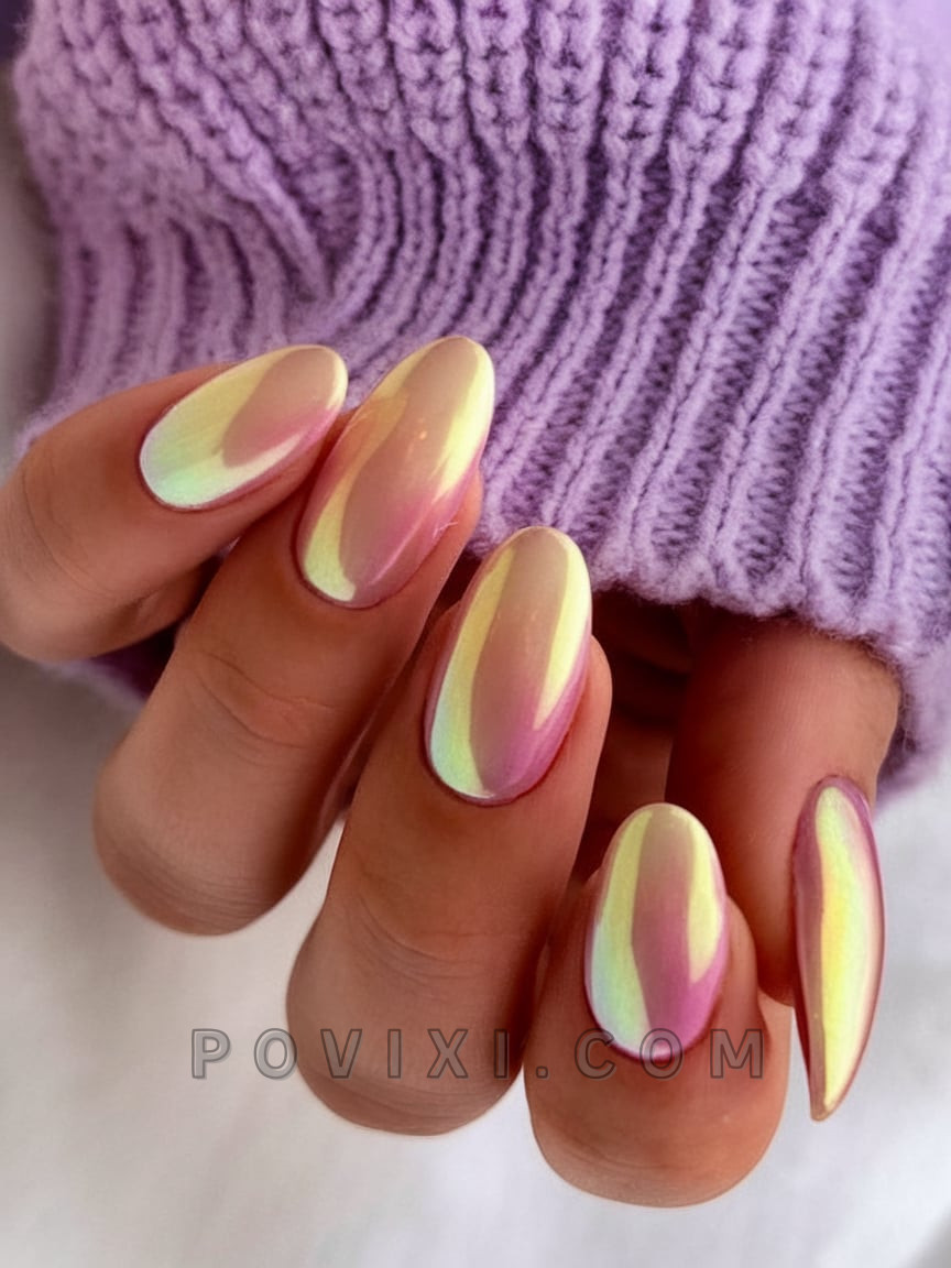 The current holographic trend is visible throughout 2023, yet this set offers a beautifully smooth look instead of excessive sparkle. The soft almond-shaped nails feature pastel shades in a multi-tone ombre including yellow, pink and lilac with a sunlight-reflective chrome finish that glows in outdoor light. These futuristic nails present a natural style updated with futuristic elements, making them suitable for people looking for trendy yet practical options. The lavender top coat with its undertones would perfectly enhance the look when paired with these nails.