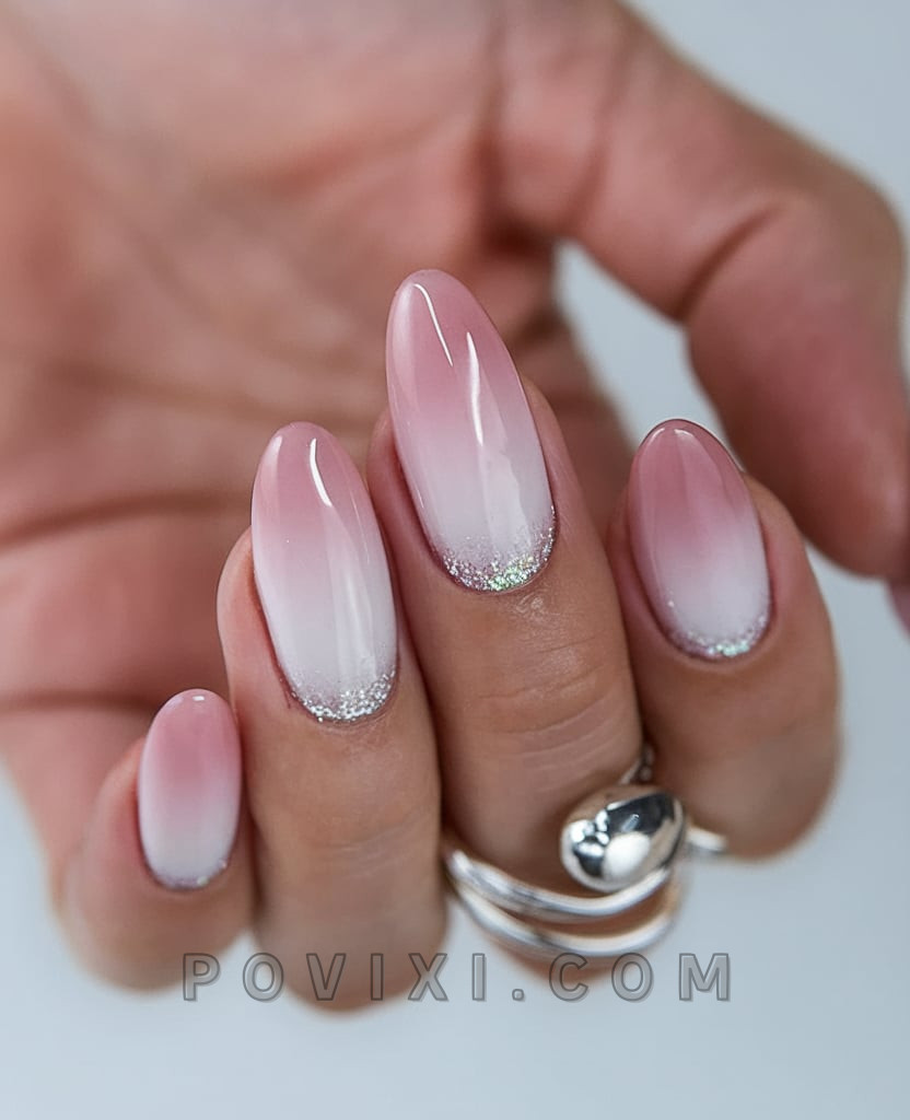 When you want an elegant look for short glitter nails, these clippers offer an upscale style. The almond design brings together a soft rose-pink gradient that fades into delicate silver glitter at the cuticle – a reverse French style that shimmers perfectly. This nail design works best on natural and gel nails and is a great choice for weddings and garden parties or for everyday use to enhance your look. Accessorize with rose gold jewelry and silver accessories.