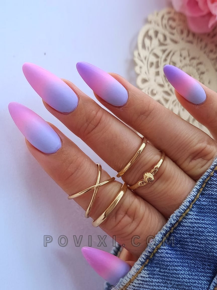 The sunset sky is captured in a matte ombre design in a bottle. The almond-shaped nails reveal a flow of blush pink beginning in lilac, creating an airbrushed effect. A minimalist, artistic manicure option, the patterns appeal to pattern-loving women who prefer modern styles that retain their whimsical quality. The nail color is exquisite when worn with denim jackets and stacked gold rings.