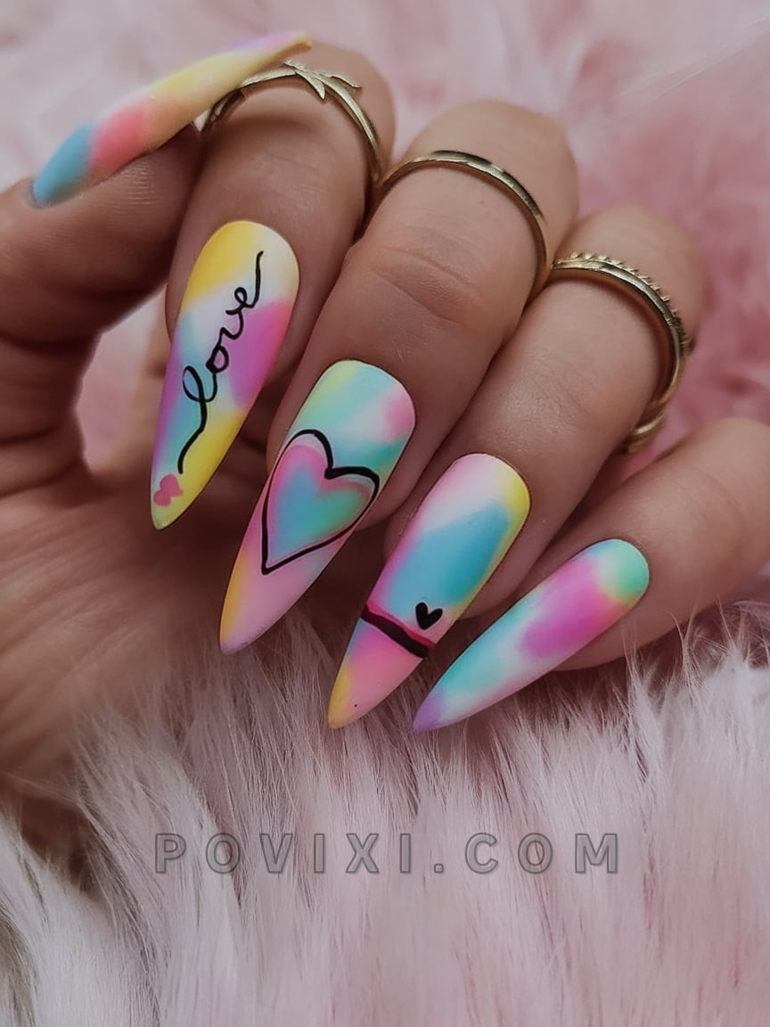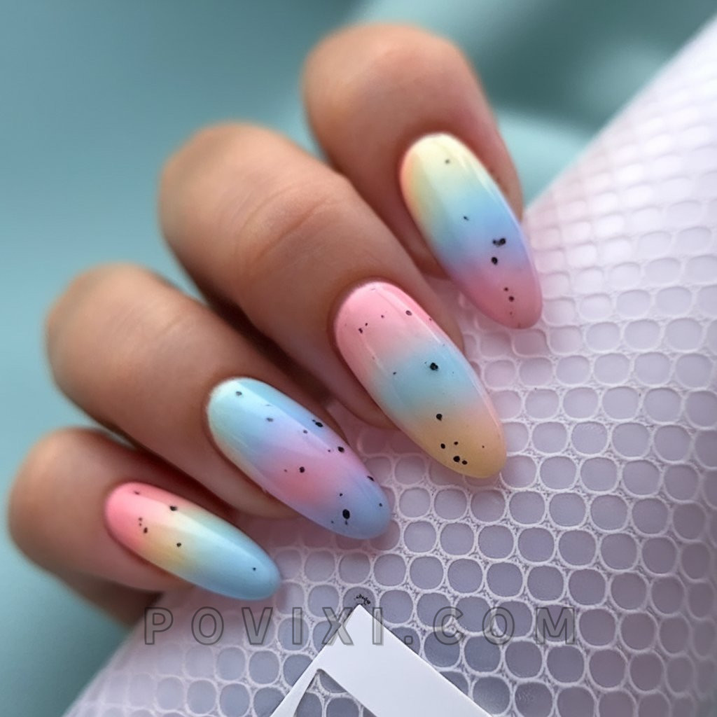 The sherbet set is one of the most beautiful nail designs on this list because it incorporates a rainbow theme with personality. Pastel pink turns to peach, then yellow, then mint, and finally baby blue as the ombre gradient moves across the nails with black speckles for an artful splatter motif. The set works well on round or oval shaped nails, providing artful nuance rather than excessive decoration. The nail set is suitable for casual summer socializing as well as poolside relaxation and art gallery visits.