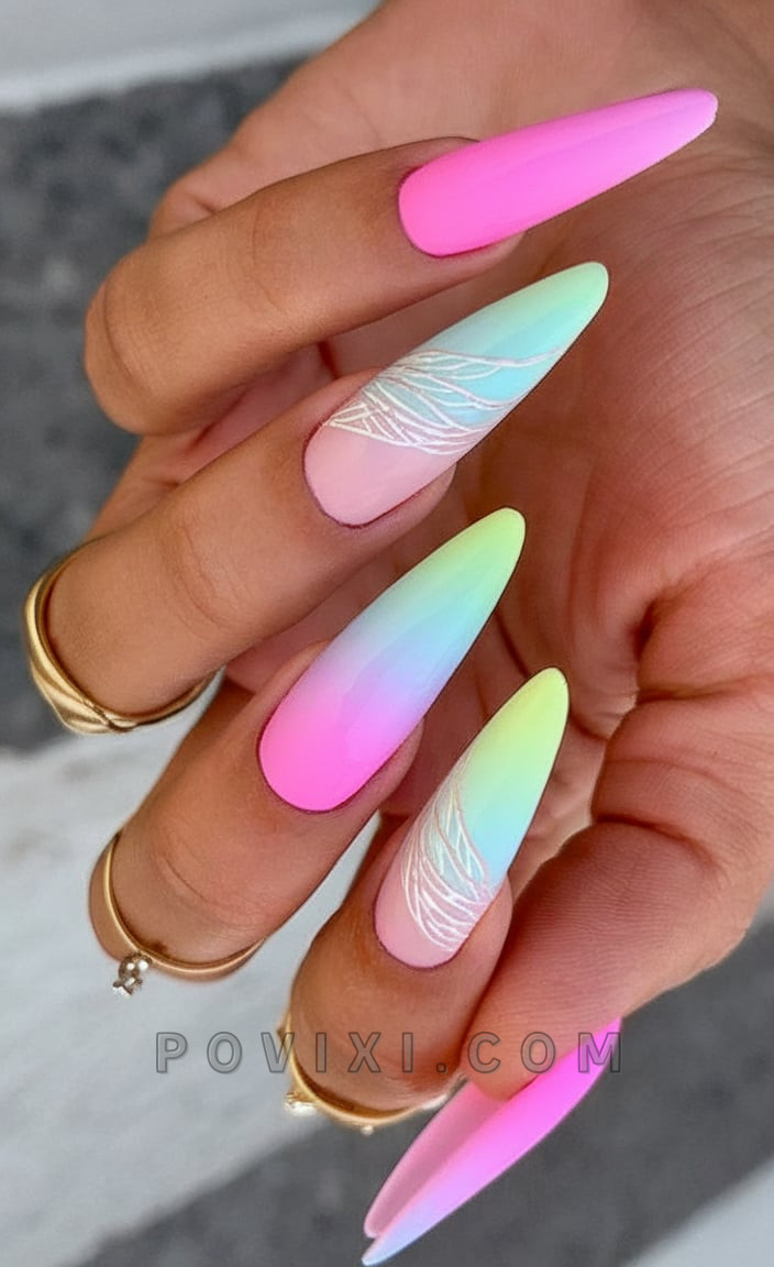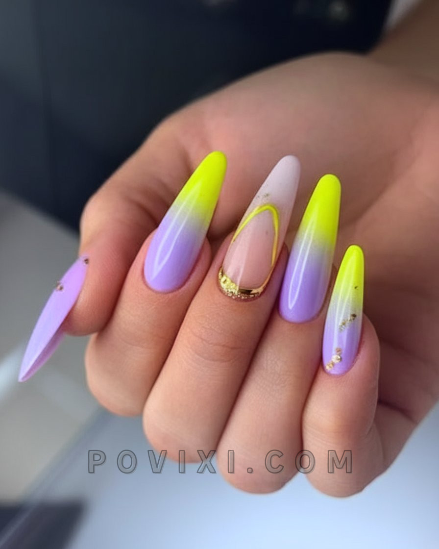 Here, lavender and neon yellow combine to create both elegant simplicity and stylish fashion appeal. A vertical ombre effect along the stiletto tips creates an artistic touch that pairs perfectly with delicate gold detailing and thin stripes to compete as one of the most fashionable nail styles for 2025. High-end events along with weddings match perfectly with this gel nail look. Wear this combination with lavender slips and tailored yellow linen outfits and minimalist accessories. The pointed nail design elegantly elongates the fingers for a high-fashion look that modern, fashion-forward women will love to see on their summer Pinterest boards.