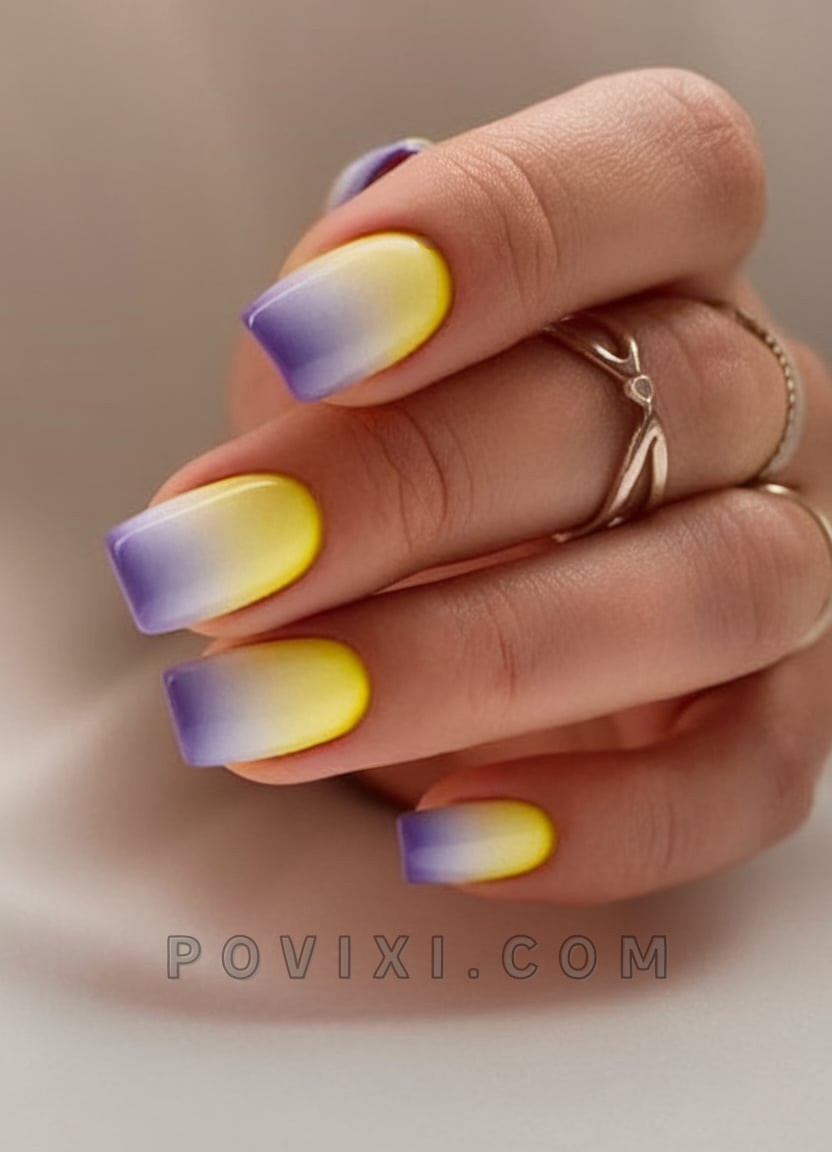The square nail design offers understated style appeal for minimalist women who want interesting nail designs. The watercolor-like mix of yellow and lavender creates an ombre effect that resembles a beautiful sunrise. The matte finish exudes a stylish sophistication that works well on both work days and warm weekend days. The short manicure option suits women who either want to keep their nails bare or opt for simple dip nails. Wear this pastel blouse and white jeans combination with delicate rings to reproduce the flow of color. The nail design is suitable for various occasions, including lunch outings and casual work meetings, while serving as a perfect companion for outdoor drinks.
