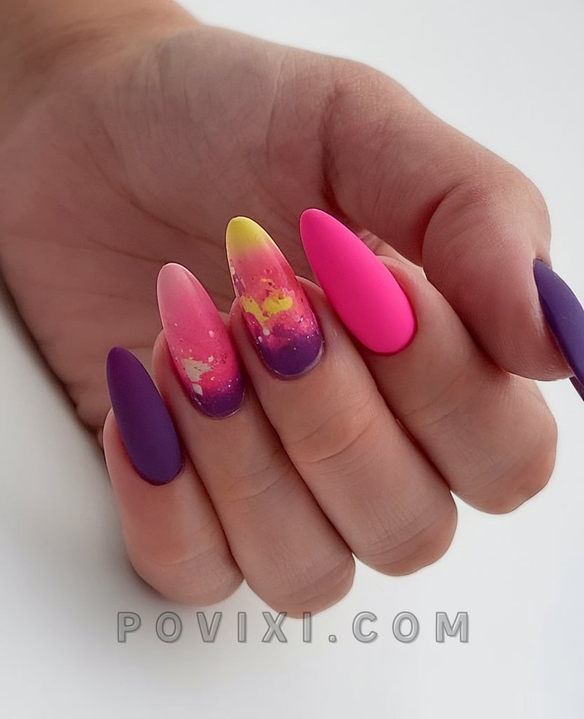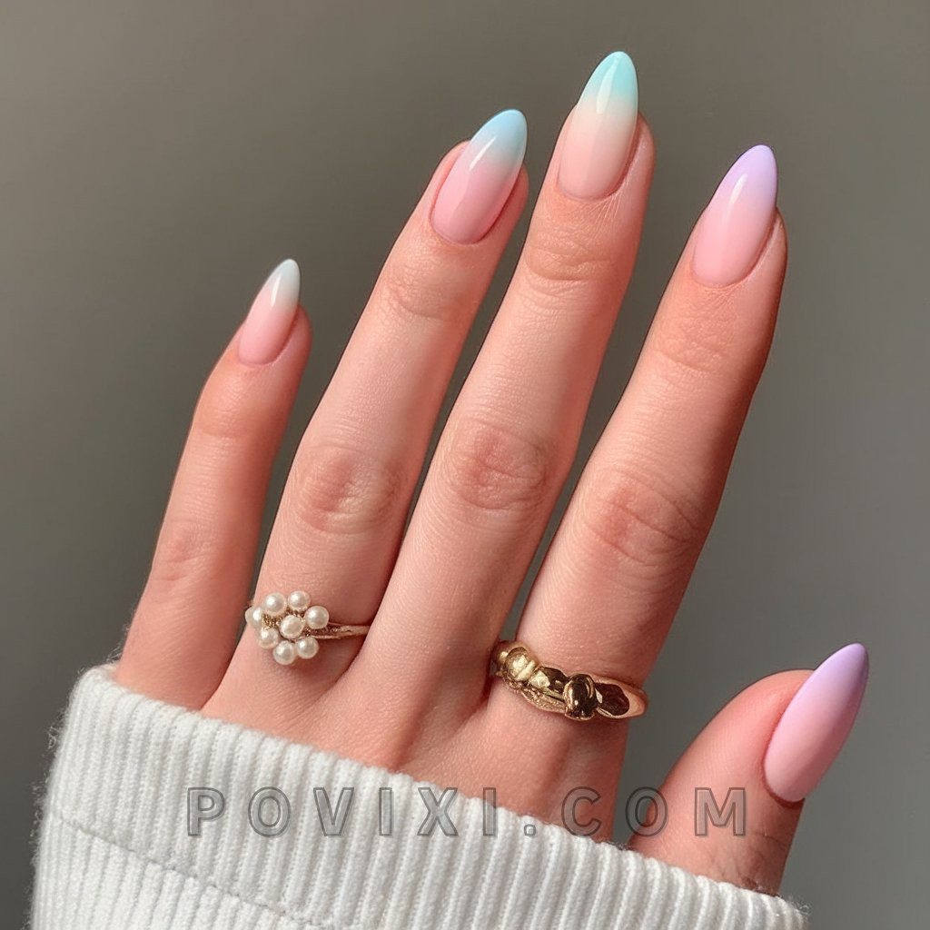 Nails become an instant source of pleasure. Gradients of pink, blue and lilac create a creamy pattern reminiscent of sweet gelato enjoyed on sunny summer days. The almond shape enhances the overall effect of the cheerful color combination into an attractive style that combines sweet charm with elegant sophistication. One of the best nail art choices for spring-summer transitions. These nails work as a bonus because they match casual and semi-formal clothing styles.