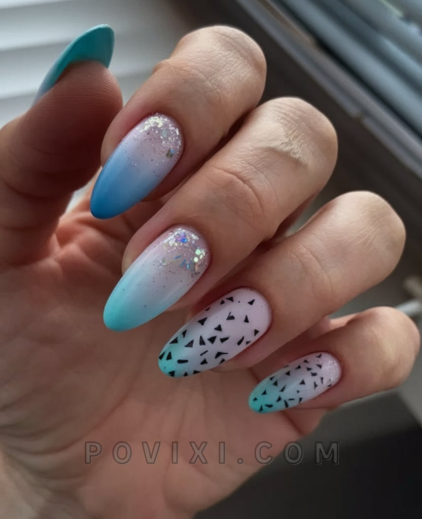 The frozen image of a tropical beach wave is the inspiration for this special design. A rainbow blend of dark aqua to bright white serves as the base for light silver glitter and tiny black triangle embellishments. A fun personality establishes this nail art to excel during festival season as well as summer pool parties and Miami fun activities. Choose oval or short almond-shaped nails for a harmonious mix of edgy and elegant style.