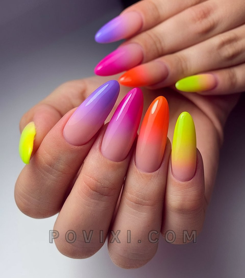 These bright neon nails in a squoval shape represent the style of summer 2025. The nail polish represents an electric color spectrum that transitions through violet to fiery orange before stopping at lemon yellow. The glossy finish enhances the vibrant colors and the square shape fits most finger types. The unique design of these gel nails will draw attention to your hands in activewear, neon swimsuits or monochromatic outfits. Women who demand an unapologetically bold personal style should wear these nails to match their fearless attitude toward color.