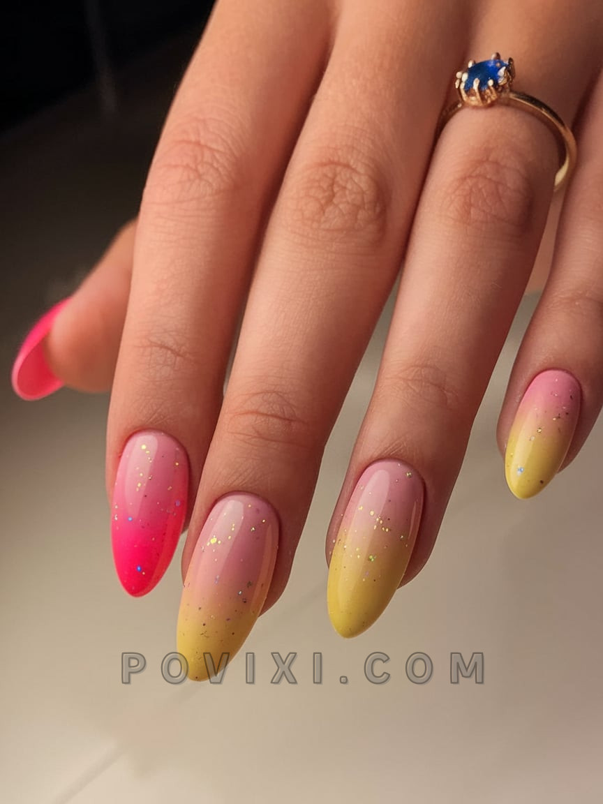 You are enjoying a cool pink lemonade under the sunset light that glistens on your nails. This ombre creates a joyful transition between hot pink and yellow with soft glitter between the colors, making it one of the most uplifting ideas on this list. Coffin or almond length nails work well with this style, which stretches to an almond shape or continues as a full coffin design. Soaked in sunshine at your brunch date or beach getaway, this nail design stands as one of the best summer_emlrtek styles that match perfectly with vibrant dressing.