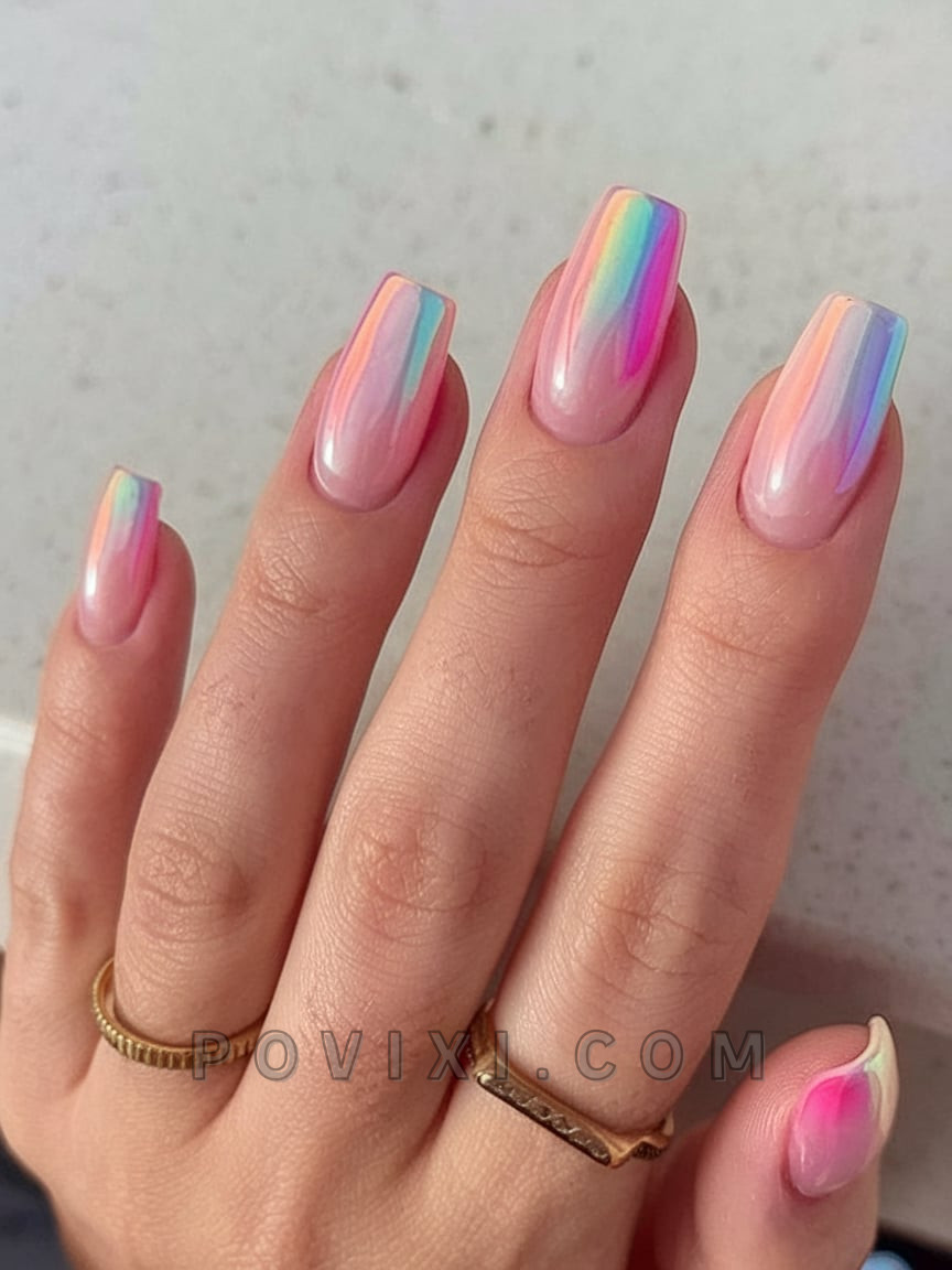 The 2025 trend for chrome nails features a delicate rainbow design layered over clear pink for a soft appeal to femininity. Fashionistas who like to balance strong elements with subtlety should choose this square design for its editorial texture. This combination works best with gel nails for maximum shine and protection. The style tip tells you that this nail set creates an eye-catching look when paired with pastel clothing or a white linen ensemble.