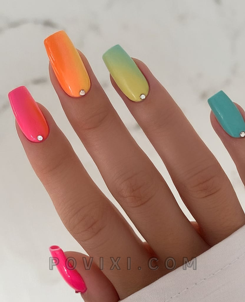 No one can resist the magical mix of colors in this design. A summer carnival atmosphere is created as these fresh colors including neon pink, orange and lime green and blue blend together perfectly. The combination of rhinestone accessories and this design makes it clear that this nail style belongs to the most prominent design category of 2025. Anyone who wants to attract maximum attention should consider using these square nails. These nails are perfect for concerts, beach vacations, and showcasing your flair for extravagant designs.