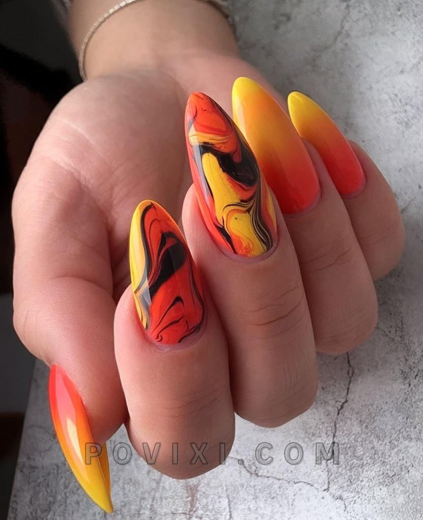 A vibrant combination of reds, oranges and yellows with swirling black in almond-shaped nails makes a powerful fashion statement. This red-orange-yellow ombre features black marbled patterns that create the natural look of real fire. Thick almonds topped with smooth paint will spark your vitality when you want to heat things up. This look consists of leather jackets paired with red lipstick and an overflowing confidence that speaks louder than words.