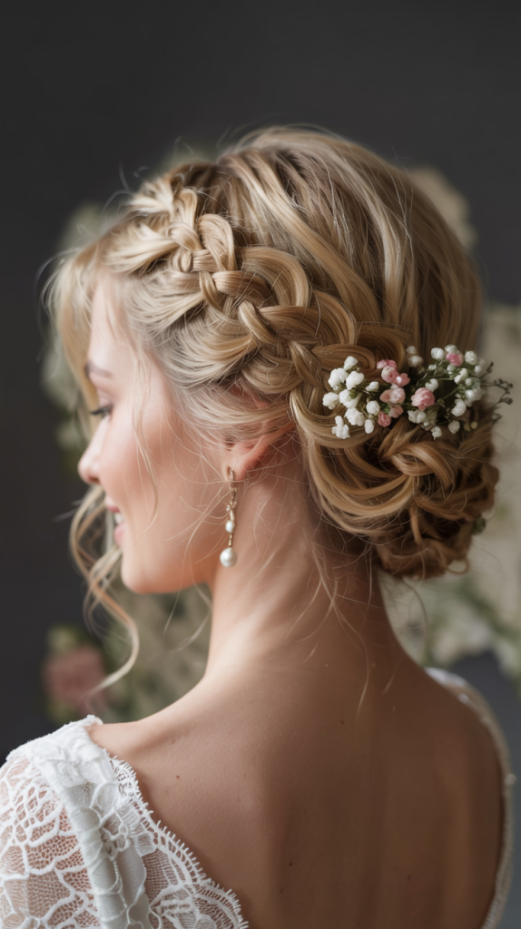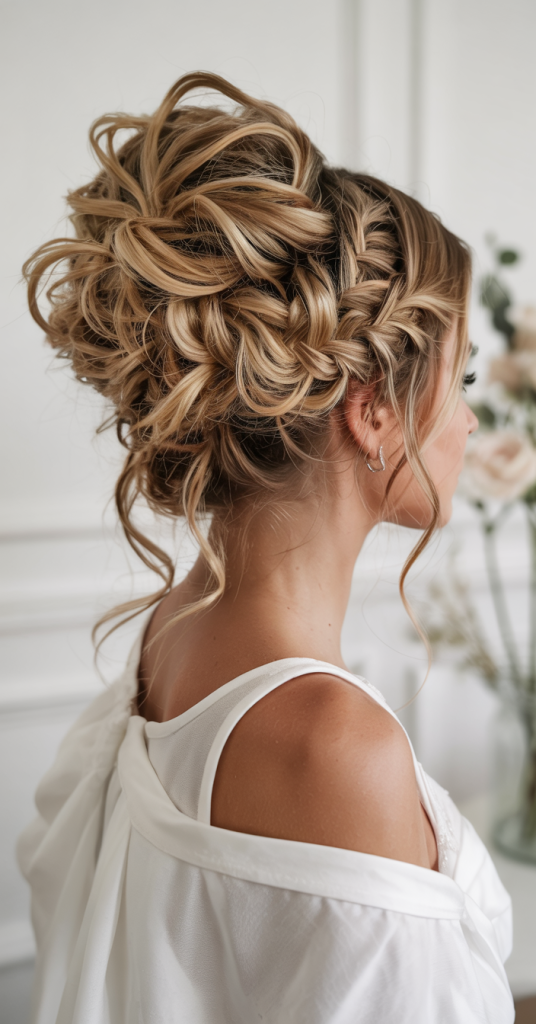This breathtaking updo mingles the intricate braids with the heavenly eaten curls that give a young ideal fairy-tale impression. There is the weaving look, which provides a visual depth and the romantic touch of the cascading tendrils to finish. It is a style that is formal yet carefree, ideal to the bride who would like to have a touch of flair to her wedding ensemble.