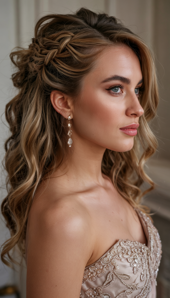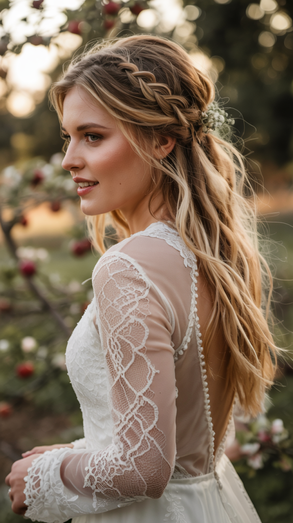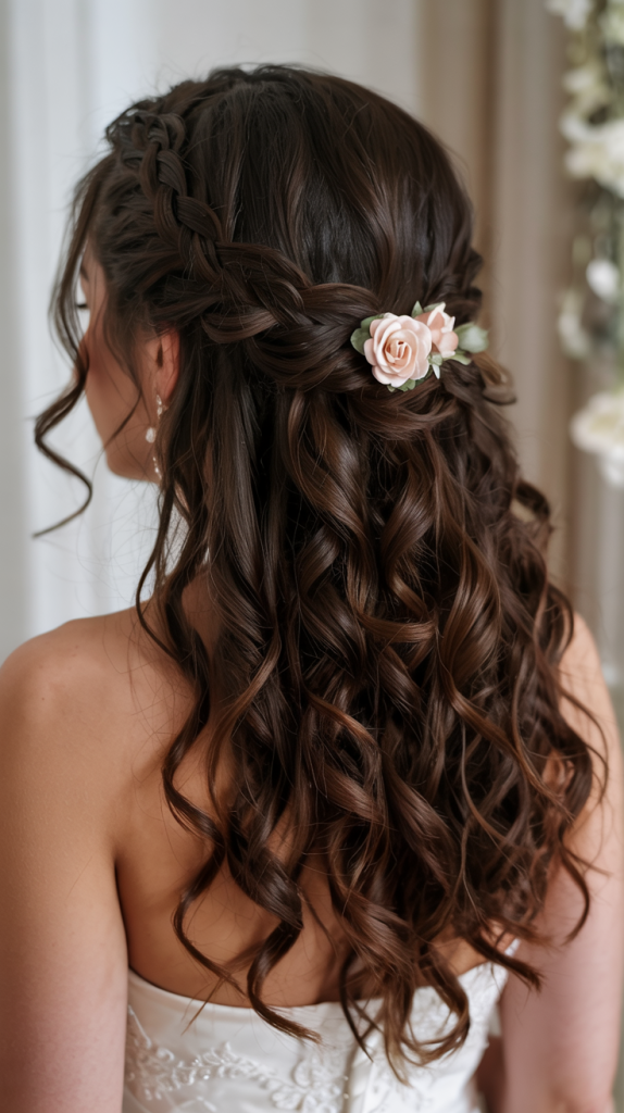 It is a half up half down feminine style in which soft curls are joined with a delicate braid. The braid is looped around the head and it comes together in the back with a final touch of a blush-pink rose that is a sweet romantic touch. It is appropriate enough to be both structured and soft in a style of a wedding day.