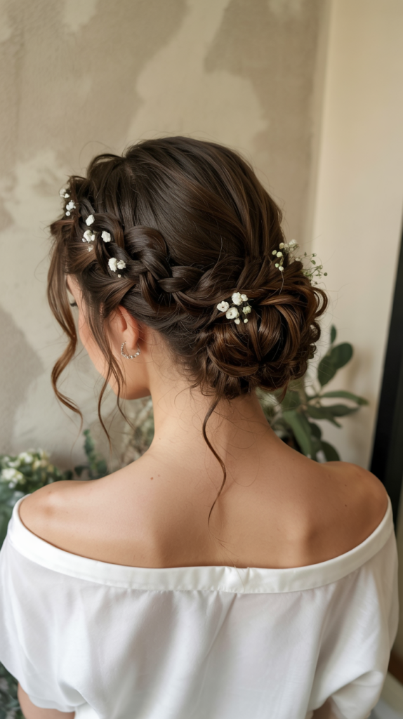 As much as it can be said, a casual updo with twisted braids and some fresh flowers is a very romantic affair. This style is incredibly classic that is why it will embrace brides who have a dream of storybook moment. The complex braid is elegantly curved around the head that ends up in a low bun decorated with tiny pink and white flowers to add a form of natural beauty. It is the type of style that is at the same time very royal and simply feminine.