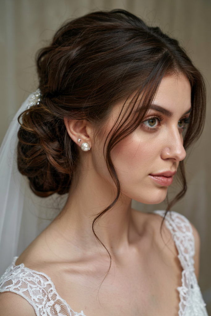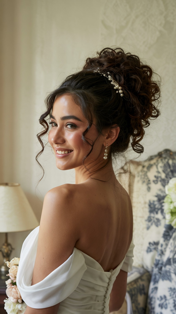 All this high bun is defined and dramatic with the curls arranged all over the top and gentle tendrils around the cheek. It makes the lifted youthful impact attracting attention to the features of the bride. It is especially suitable to weddings met during warmer weather because it keeps the hair up and out of the way. This does not mean that the style is not stylish.