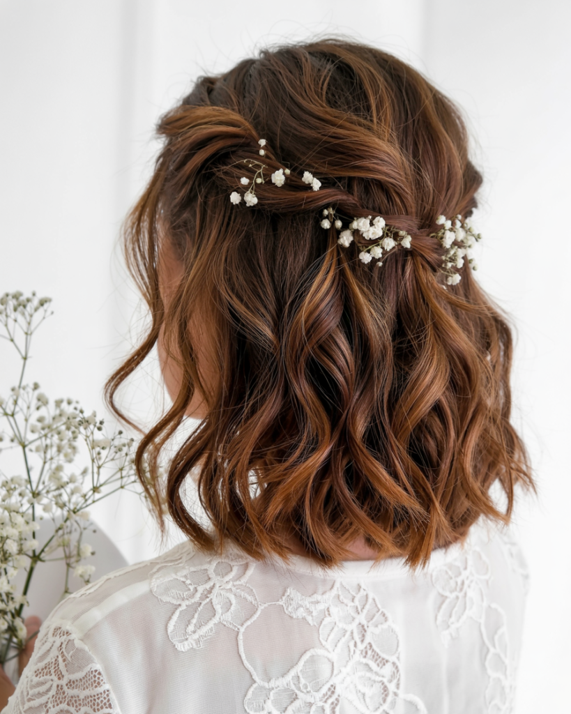 The given wedding hairstyles 2025 variant suits well short and medium hair, in particular, brides, who want to look beautiful but not spend much time on hairstyle. It looks so well with a bohemian dress or a smaller outdoor ceremony in the garden.
