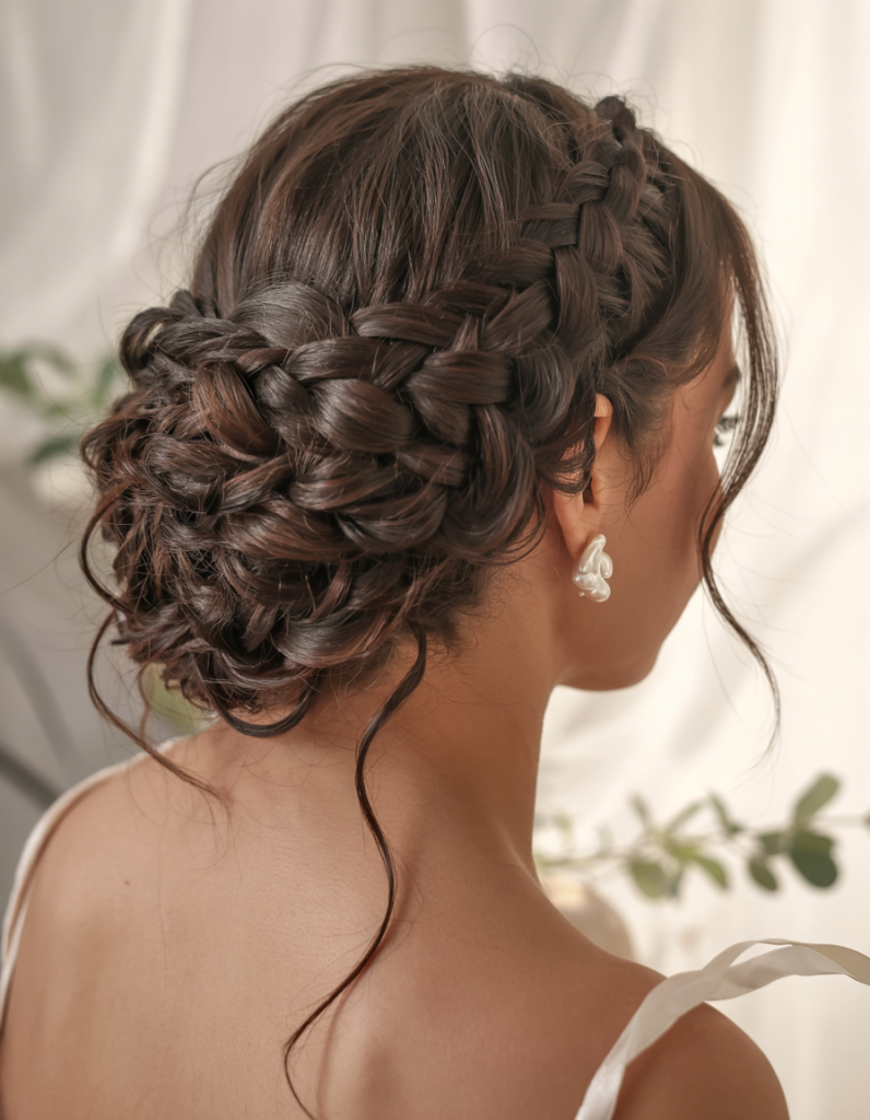 This is an actual hair masterpiece, a complete crown braid rolled up into a bumpy bun on the nape. There are curls made at the facial area which give a soft character and the framework holds everything together throughout hours. It’s regal yet relaxed, ideal for an elegant celebration.