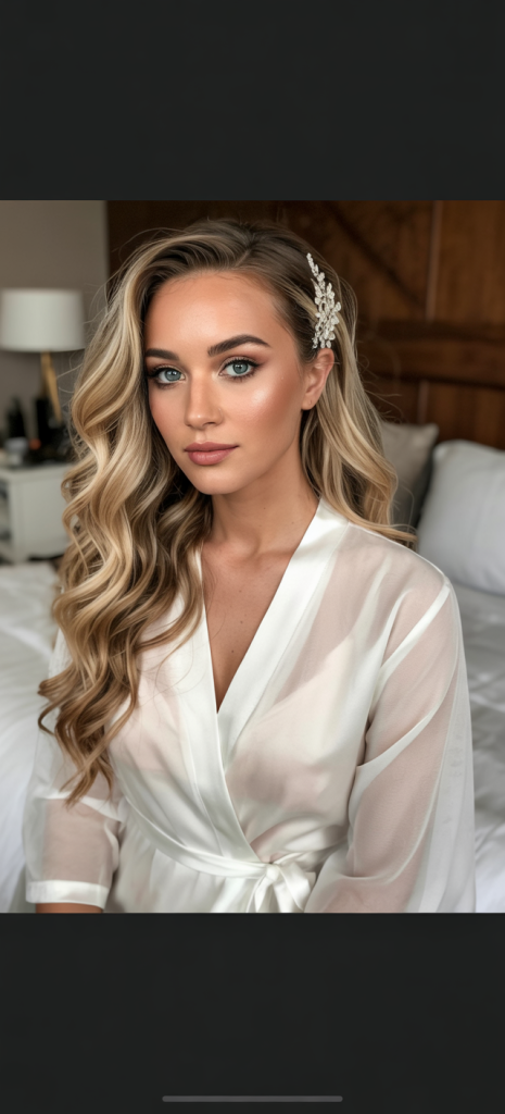 The hairstyle is custom fitting to long locks and medium hair as a part of the wedding hairstyles 2025 assortment and looks especially good when using a natural wave or curl. The light curl cream maintains the shape in place and the floral accessory ties in quite lovingly with a bouquet or bridesmaid accents.