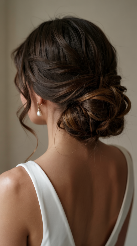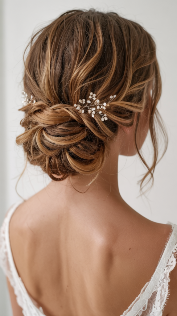 Complex and elegant, this low bun is done in softly twisted layers and is decorated with the light sprigs of pearls. It is an eternal style that can easily combine with lace or satin dresses. The slightly undone finish keeps it modern and effortless.
