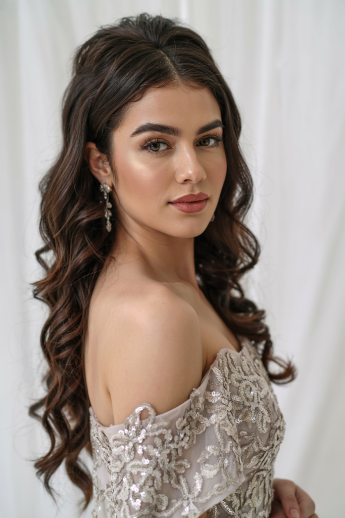 This half up half down style is a natural beauty with full dark brunette wavy hair framing the face with exquisiteness. The little pick up at the crown makes it finished without removing any of the easy, romantic feel of the hair. It is the type of style that allows your personality to spark.