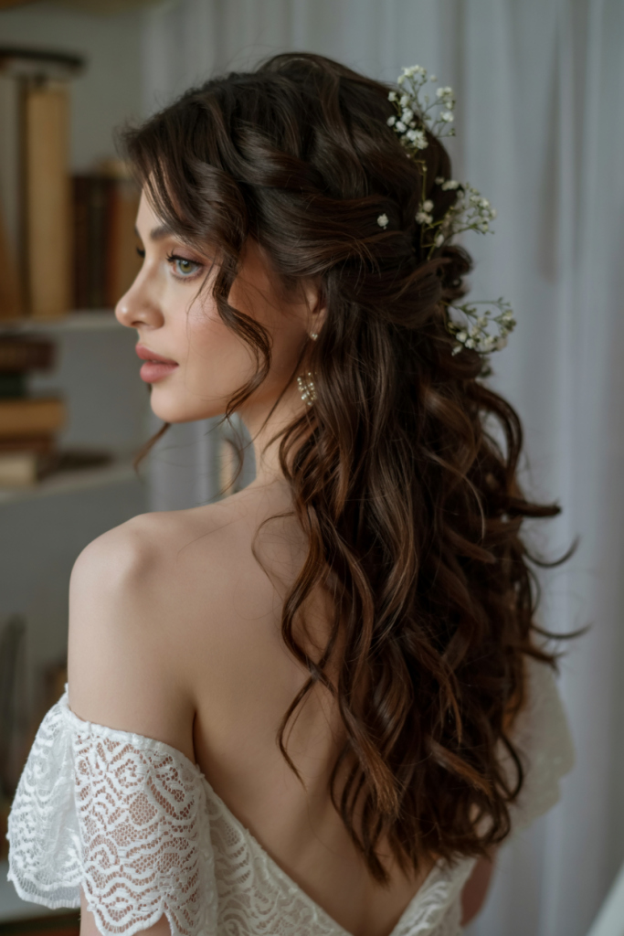 An outstanding hair style made on wedding hairstyles 2025, it should be long or medium with natural waves or curls hair. Firmly fasten the flowers using hidden pins so that it is not dislodged during the day.
