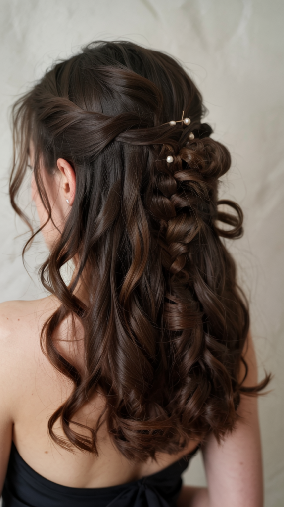 This elaborate braid half up is done in several twists and loops and decorated by end pearl pins to add some delicate sparkle. It is elegant-looking and youthful at the same time, which makes it ideal to fit into a romantic wedding theme.