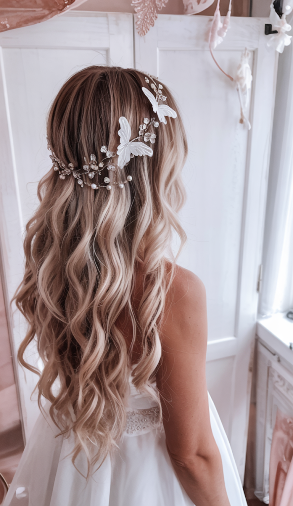 Light and airy, half up half down style can give an impression of being made specifically to wear at a garden wedding. The flowing and soft waves coupled with fanciful butterfly accents and pearls offer the kind of look that is as romantic as it is magical. It talks of blossoms and sunshine through the woods.