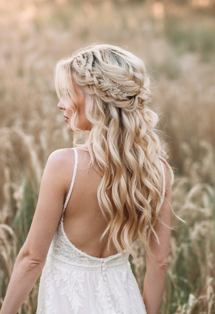 It is a work of blending in whims of a braided crown and romantic loose waves. The single braid is styled against the hairline gently flowing into the mid length hair which is cascading into loose natural waves, which makes it fit best when utilized in a rustic wedding or outdoor wedding. The tissues are light and breathy as though out on a sunlit meadow.