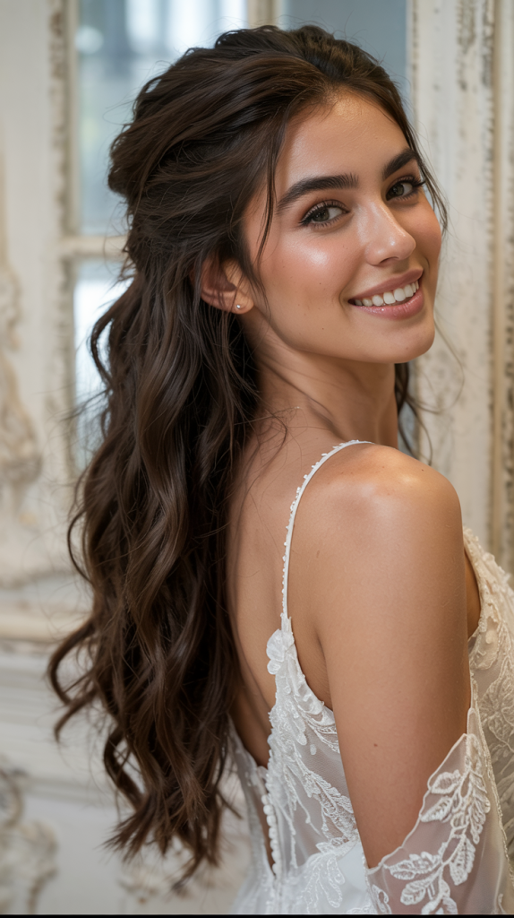 This hairstyle has a slim-form half up together with relaxed but fluffy curls that fall at the back. It is elegant combination of poses and lines that is ideal in brides that wish to have a glam but down-to-earth tone.