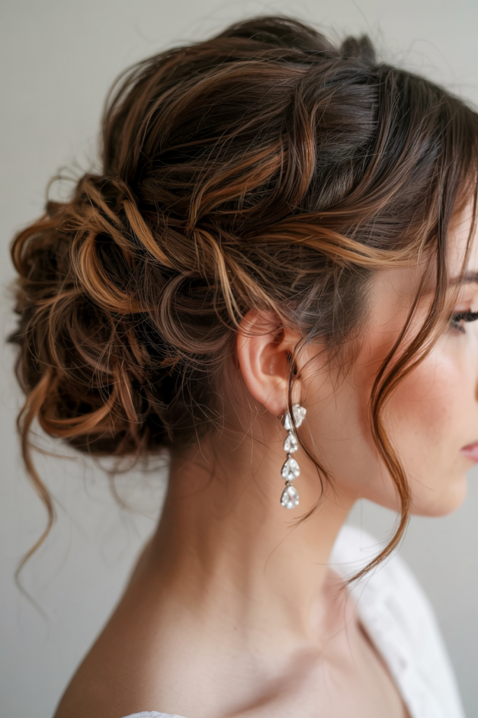 This updo would suit medium length hair or long hair and is also perfect and looks great on brides with naturally kinky or curly hair as part of the wedding hairstyles 2025 collection. The movement is intensified by a light texturizing spray and pinned at a few strategic places with a couple of pins so that even dancing does not loosen the style.