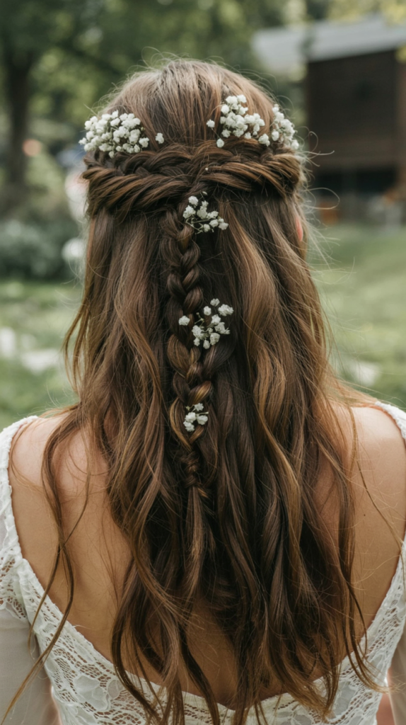 Wavy locks, untied curls, and small white flowers are combined to form a boho dream. This half up half down hairstyle employs a basic braid down the middle, accented with some tiny sprigs of baby breath to add a natural romantic look. It’s whimsical yet effortlessly chic.