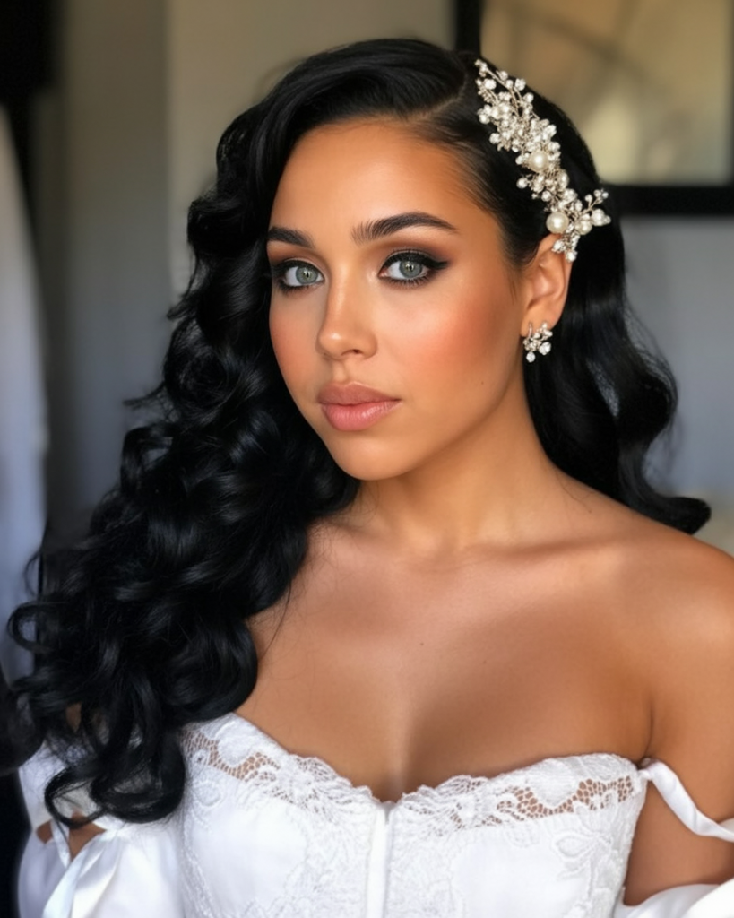 This glamorous side-swept look transports the viewer back to classic Hollywood, creating an instant sense of drama and elegance. The deep side part and sleek wave motion will highlight the features of the bride, making it perfectly suited for a bold and beautiful look.