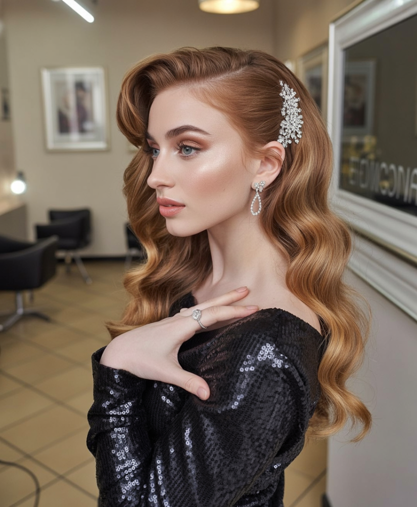 This hairstyle is both elegant and playful, featuring classic wave patterns mixed with a hair accessory that has a sparkly finish. This hairstyle has a contemporary look because it’s soft, yet it also has elements of classic styles that were so popular in past eras. This hairstyle can also complement medium hairstyles and long hair.