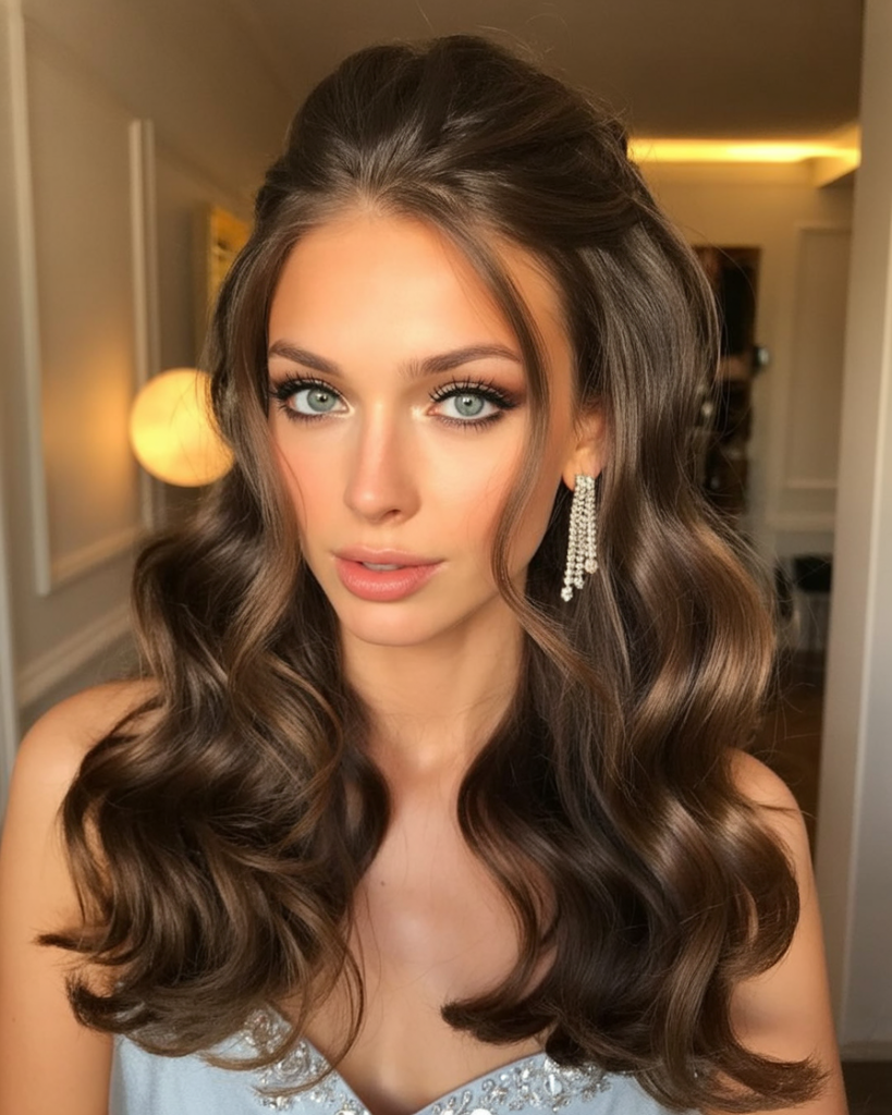 This bouffant half-up hairstyle adds volume on top, along with loose curls flowing down. This hairstyle has a glamorous and vintage look, providing both volume and motion in a single hairstyle that is both beautiful and stunning.