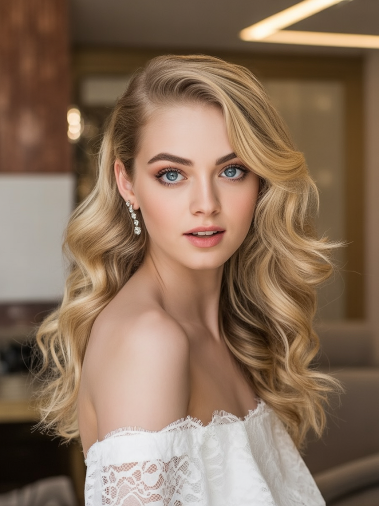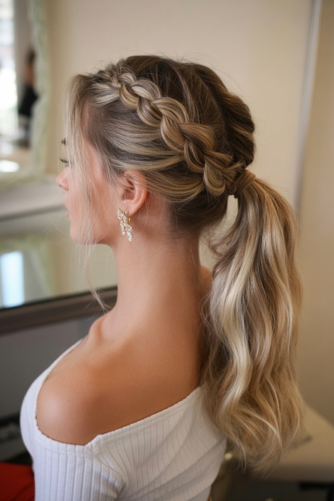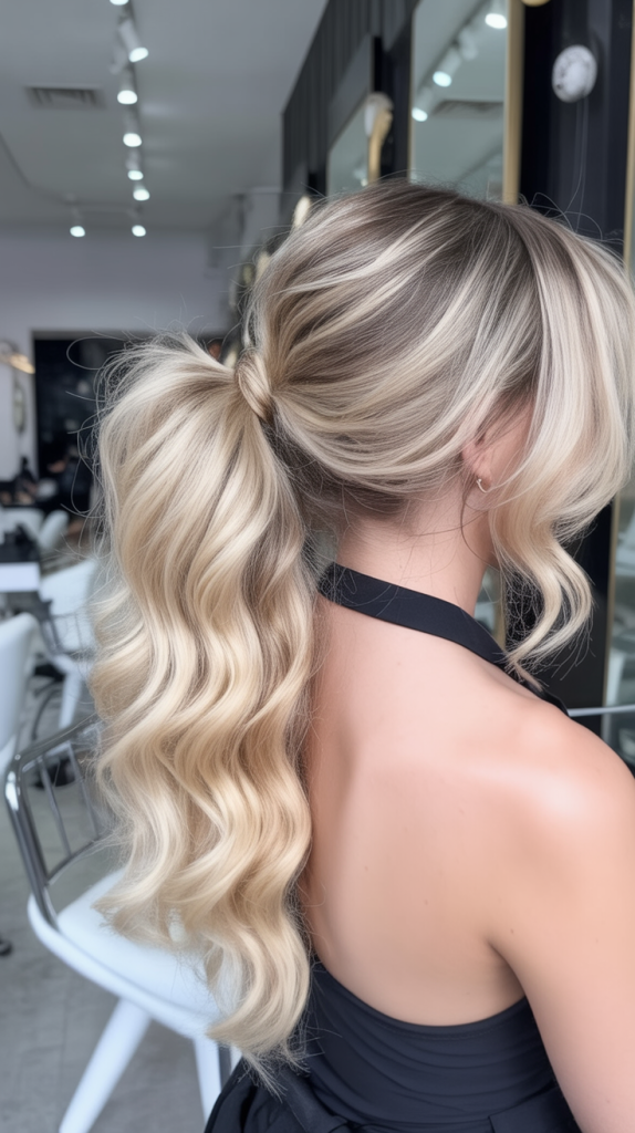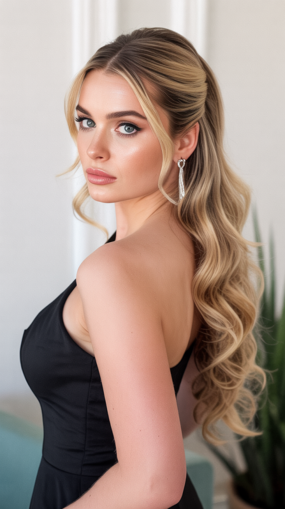 If you are looking for something elegant yet playful, then this wavy ponytail will fulfill that desire. The flowing curls along with the gentle face-framing strands will give a fresh and youthful look that will look good on either a summer wedding or a formal occasion.