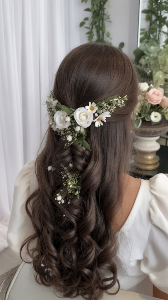 This look will look its absolute best on people sporting longer hair, and it will also complement people sporting medium hair that has slight curls or wave patterns. This hairstyle will also look stunning on bridesmaids for a boho or outdoor wedding. Among the popular wedding hairstyles for 2026, adding flowers to your look has emerged as a beautiful way to add a personalized touch to your look.