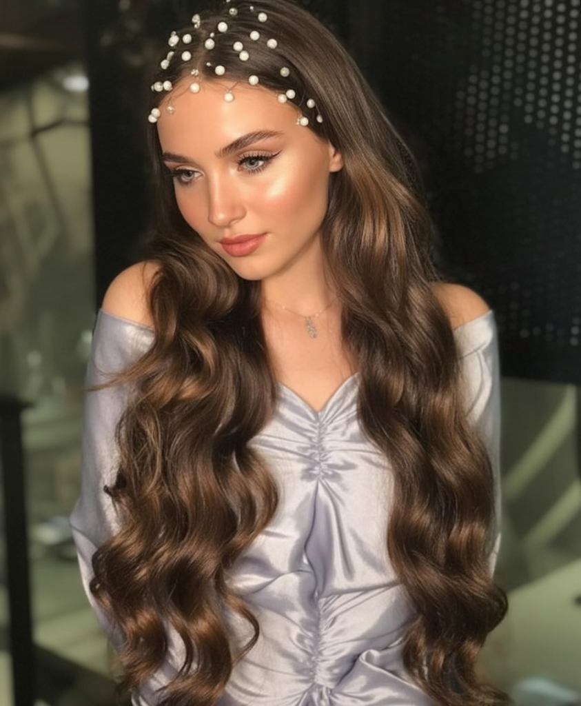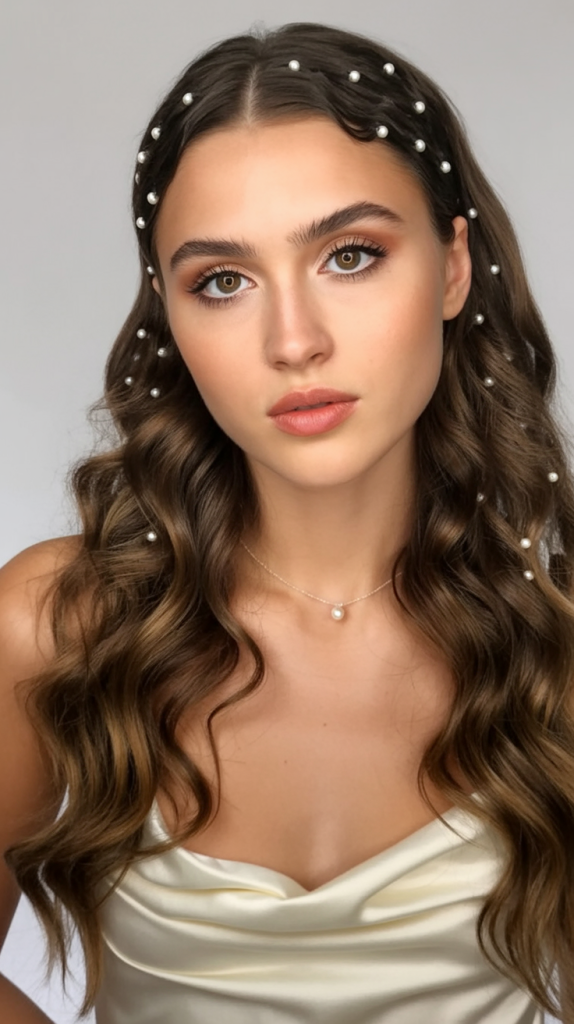 This look suits people with long hair and medium hair, particularly if they desire to maintain a soft look yet accent it with a unique feature. This hairstyle is also one of the top wedding styles for 2026 since it combines ease and drama. Pearls continue to top the trends, and this look clearly proves it.