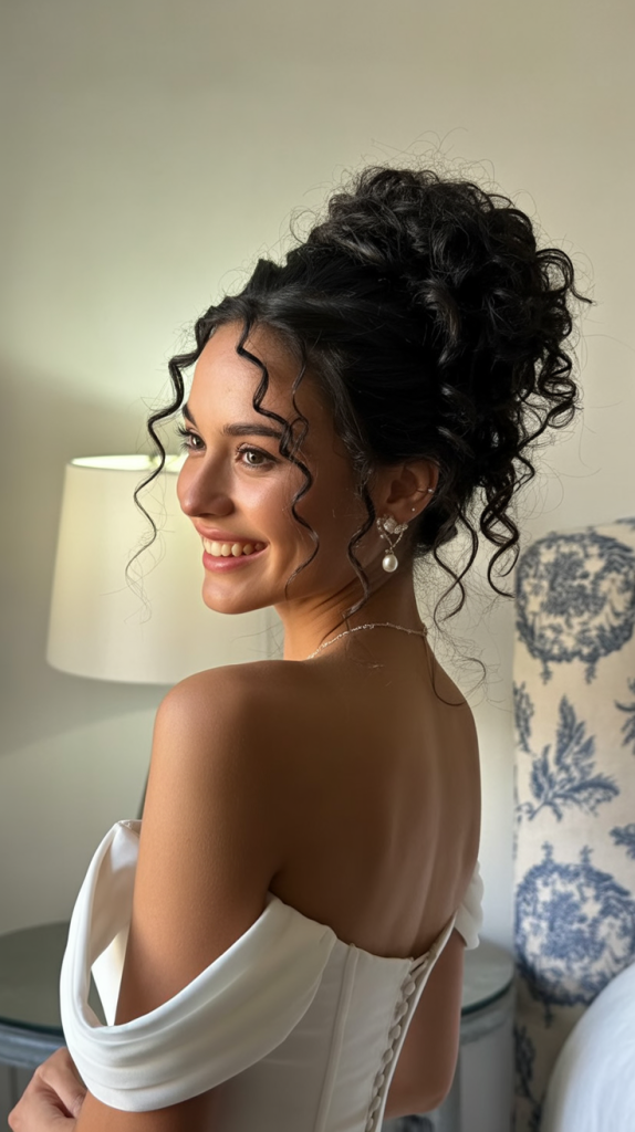 This curly updo has a happy, free-spirited look that will look beautiful on a glowing bride. The curls are bouncy and full of life, and there are only a few loose strands resting on the face to give it a gentle look. The hairstyle is so beautiful that it can almost feel like a party in itself.