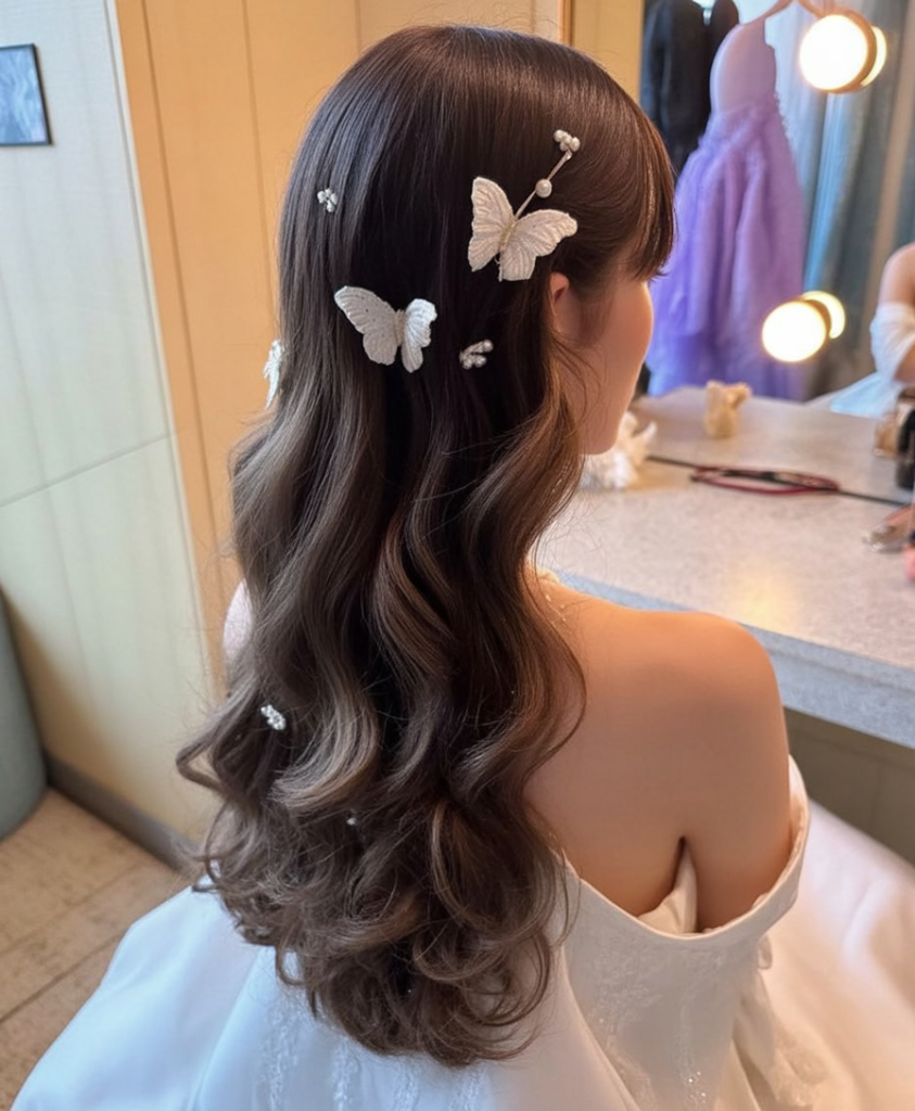 This hairstyle will look stunning for medium hair and long hair and will also look beautiful for both brides and bridesmaids. Nature’s elements, such as butterflies, flowers, and pearls, will become popular wedding hairstyle trends for 2026, making the hairstyle unique and elegant at the same time.