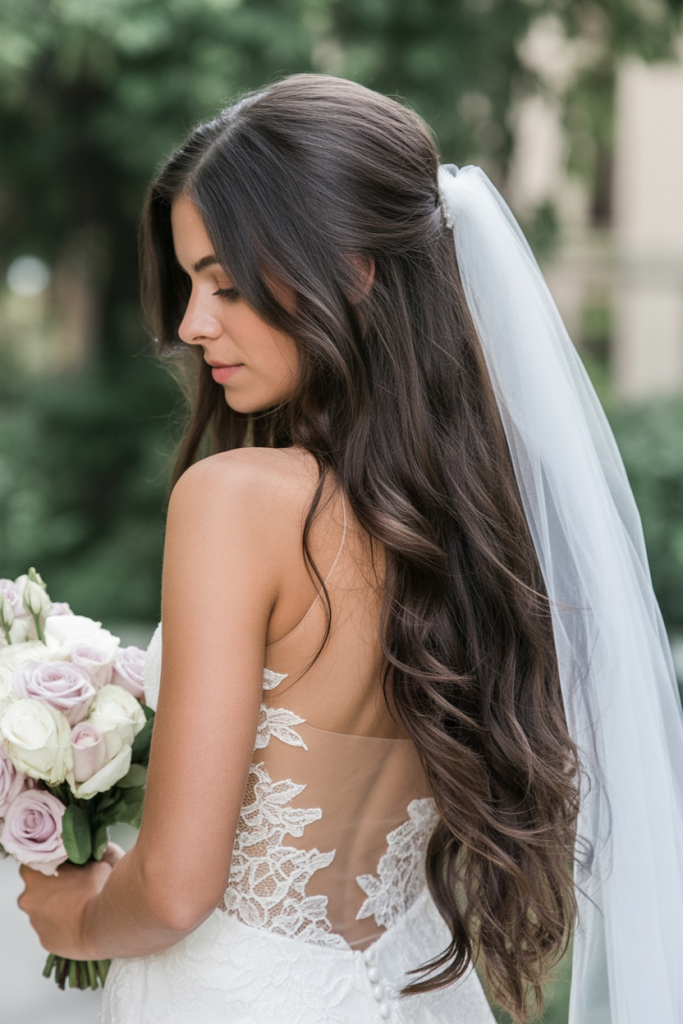 This classic and timeless hairstyle that has half-up hair, loose waves, and a veil is incredibly romantic and free-spirited. This hairstyle is the type that will never ever go out of style, both for its structure and its softness.